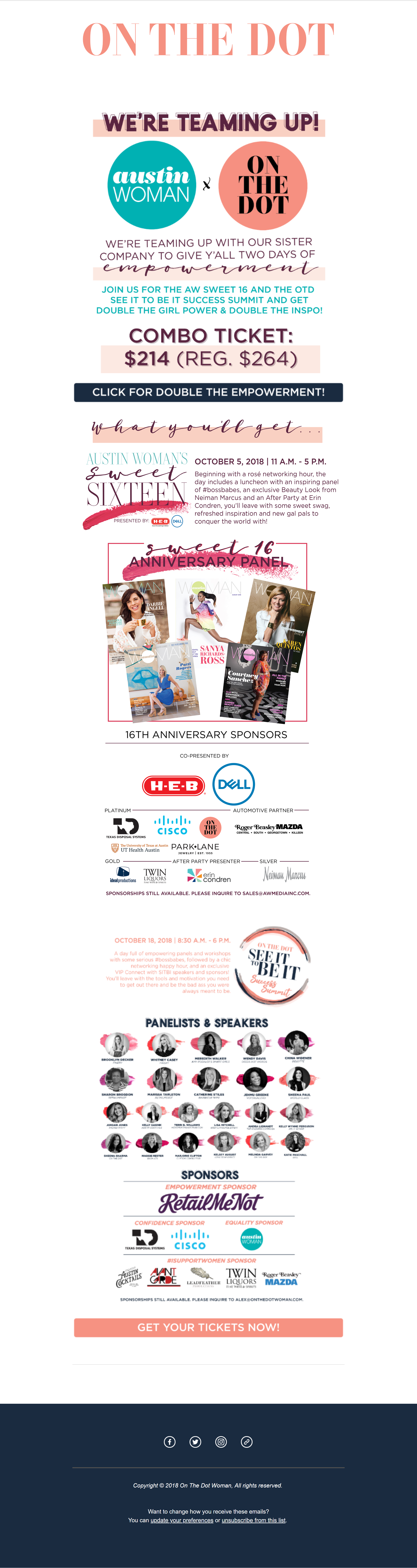 This campaign was created the promote tickets sales for both the On The Dot See It To Be It Success Summit and the Austin Woman (On The Dot’s sister company) Sweet Sixteen Anniversary event in which subscribers cold purchase tickets to both events for a discounted price.