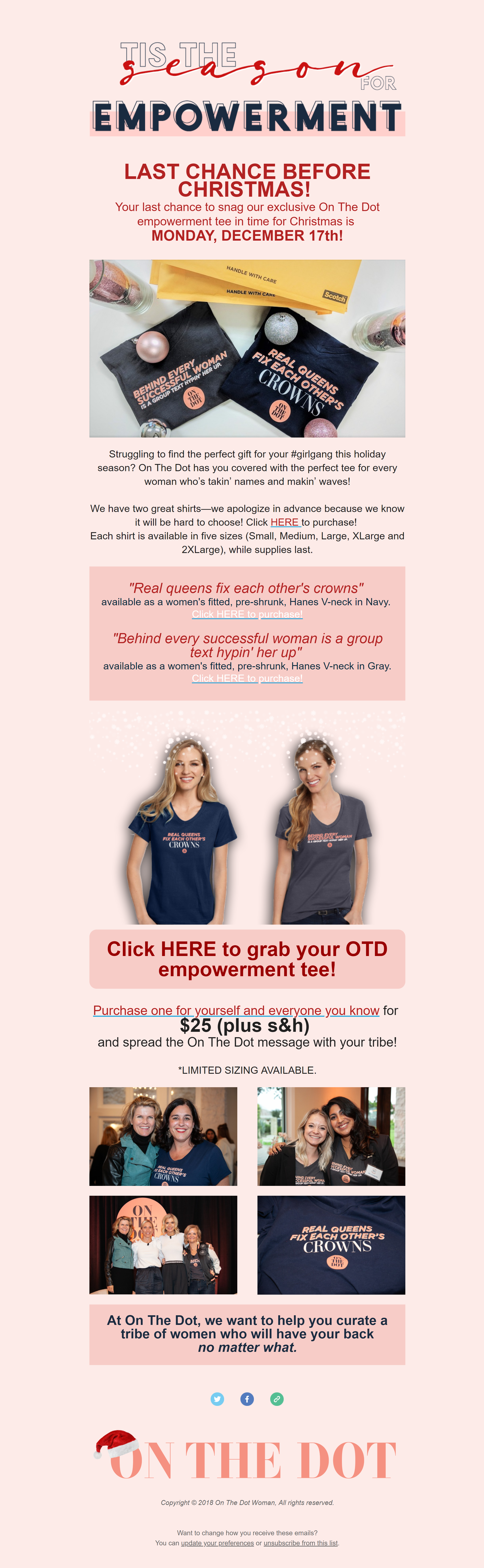 I created this campaign to sell new On The Dot merchandise during the holiday season. First made available for purchase at the SITBI Success Summit, On The Dot created a Shopify page to make these empowerment tees available to anyone in the continental U.S.